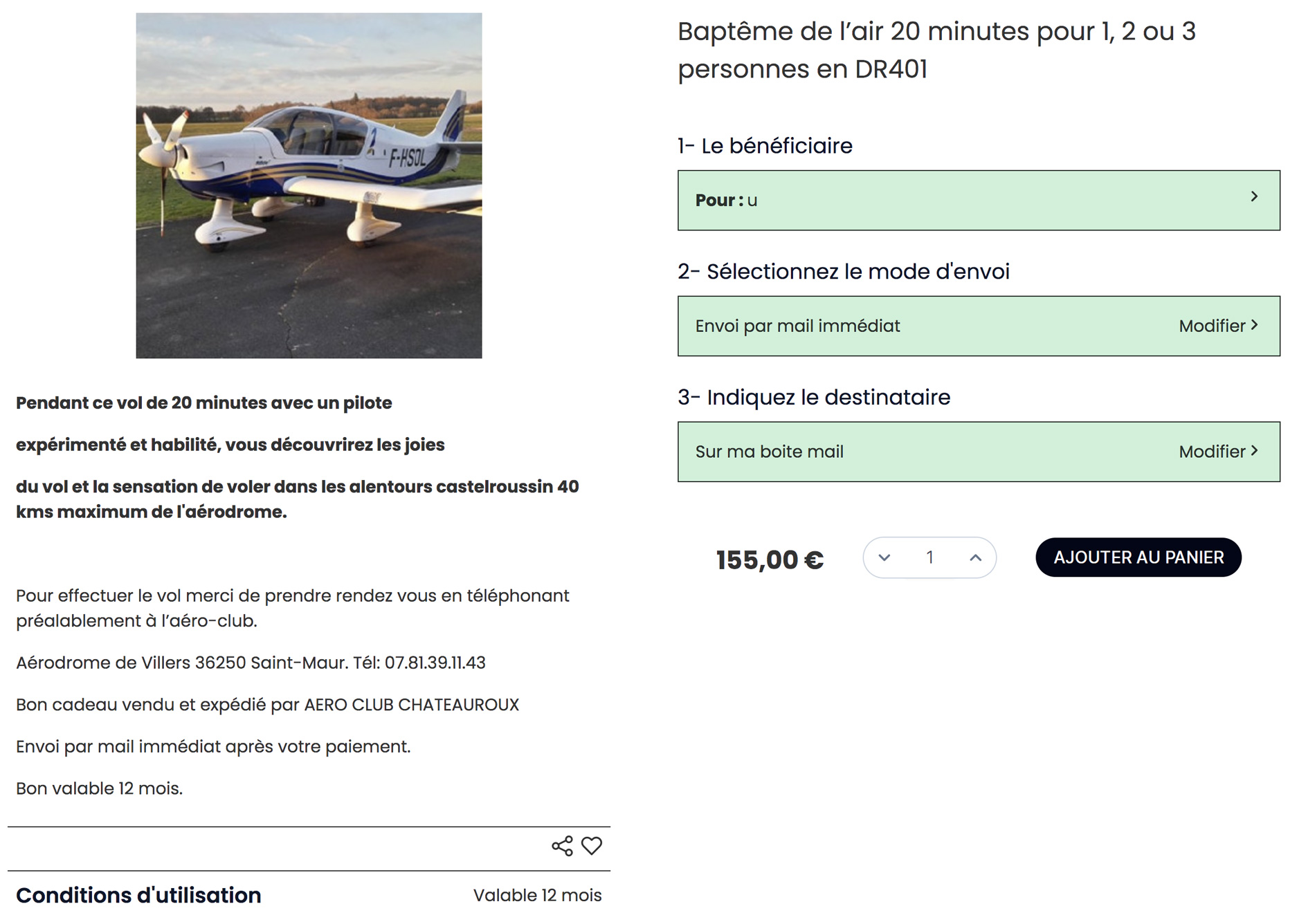 Avec My-Shoop, l’Aéro-Club a choisi de mettre en place une boutique en ligne de bons cadeaux, idéale pour offrir une expérience originale et mémorable. Les clients peuvent ainsi choisir facilement entre :