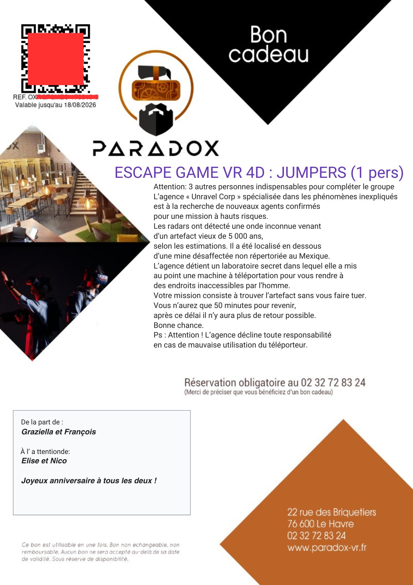 Avec My-Shoop, Paradox VR a choisi de digitaliser ses offres en proposant des bons cadeaux personnalisés, accessibles en ligne à tout moment. Les clients peuvent ainsi offrir ou s’offrir facilement une séance de réalité virtuelle, une soirée thématique ou même une expérience complète.