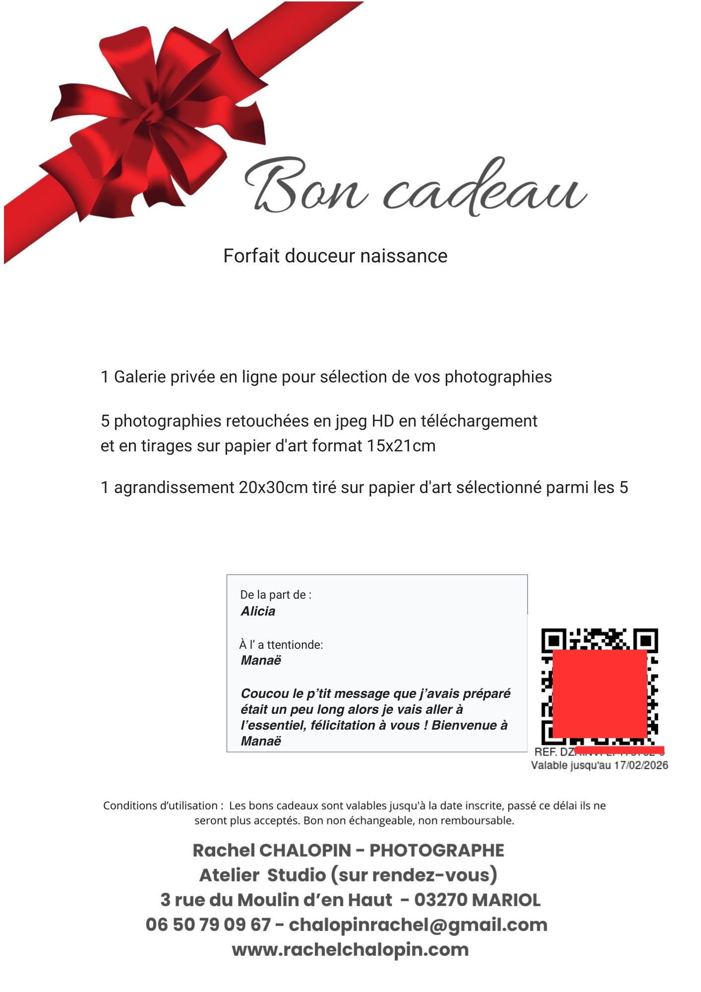 La plateforme lui permet de présenter clairement ses prestations (séances grossesse, portraits de famille, shooting bébé…) et d’offrir à ses clients une expérience simple et intuitive : ils achètent un bon en quelques clics, personnalisent le message, et peuvent l’offrir immédiatement.