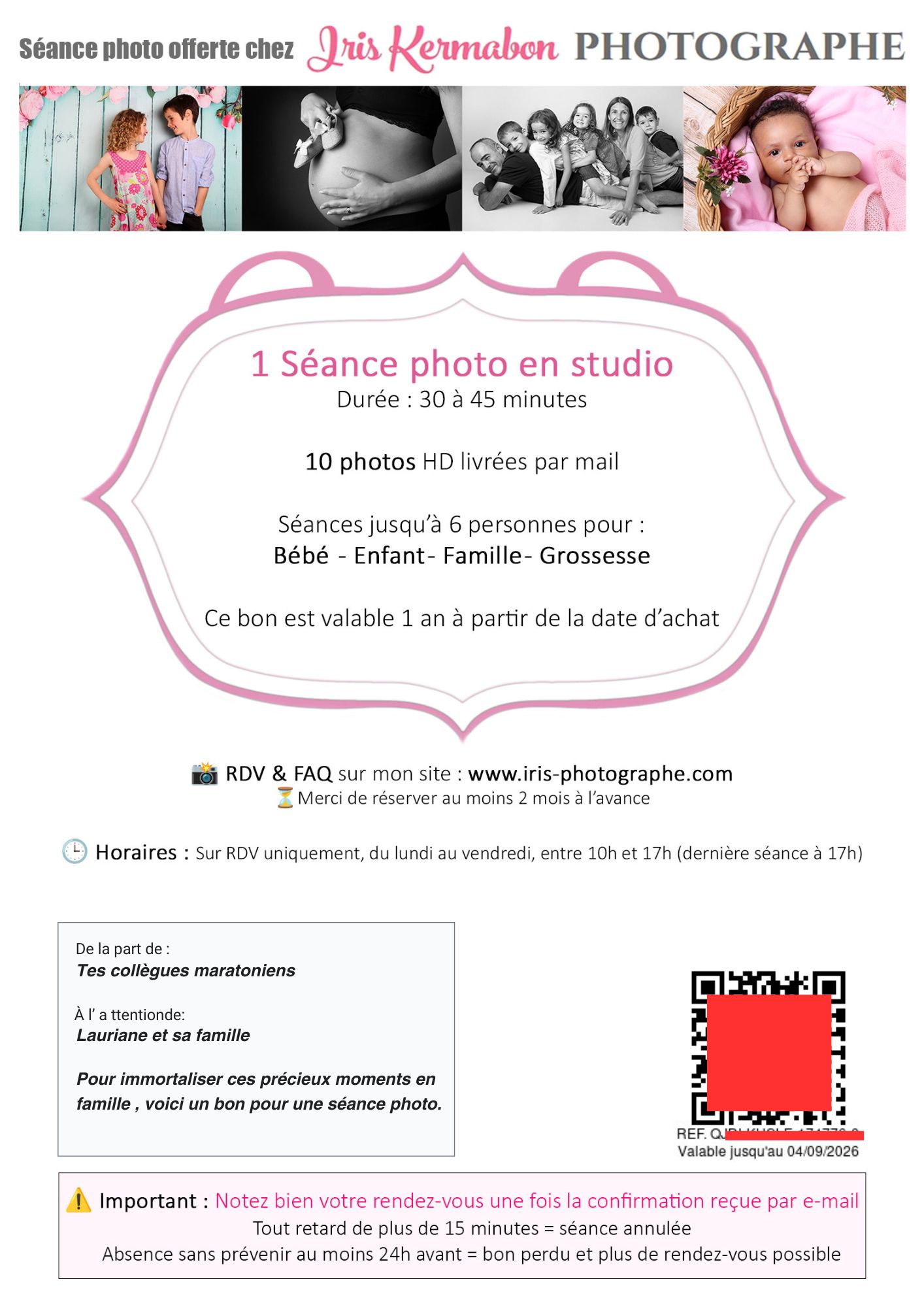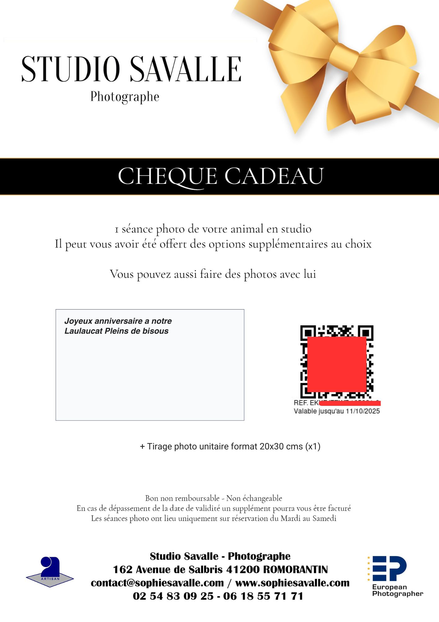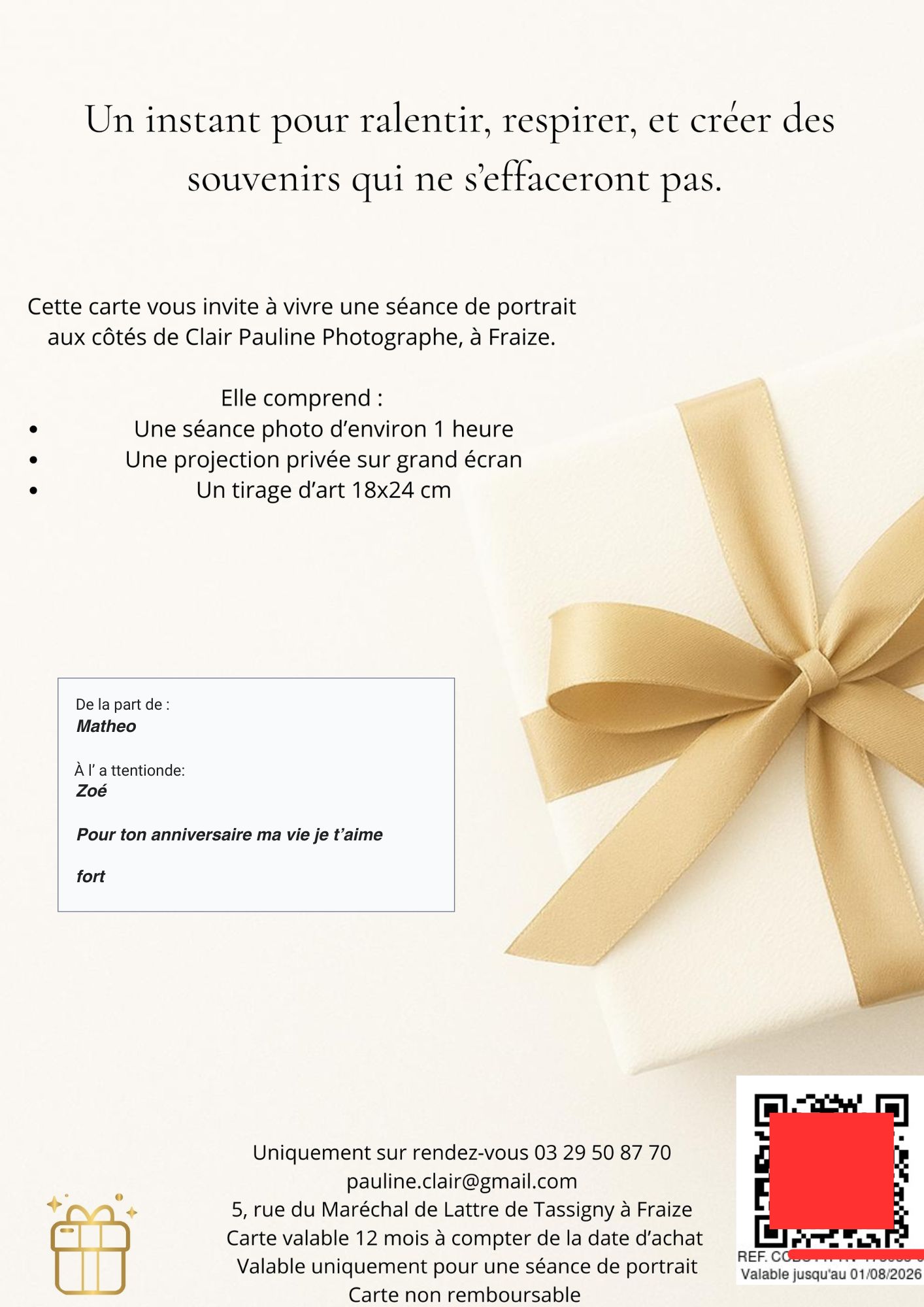 Ces bons cadeaux disponibles en ligne 24h/24 offrent une expérience pratique et moderne aux clients, qui peuvent facilement offrir ou s’offrir une séance photo unique, adaptée à toutes les occasions (anniversaire, fête des mères, naissance, etc.).